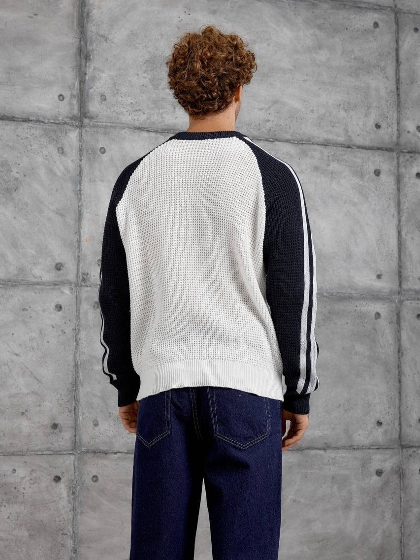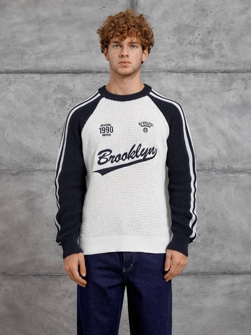 Sweat maille bicolore crème et bleu marine au style sportif vintage. Détails brodés “Brooklyn” et inspirations athlétiques 1990 pour un look rétro moderne. Coupe confortable et texture travaillée, idéal pour un style casual premium signé Ascalto.